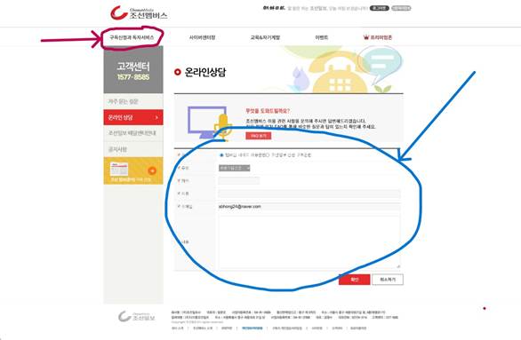공식 웹사이트 신청: 조선일보 공식 웹사이트(chosun.com)에서 아래의 붉은 색 부분을 클릭하고 들어감.