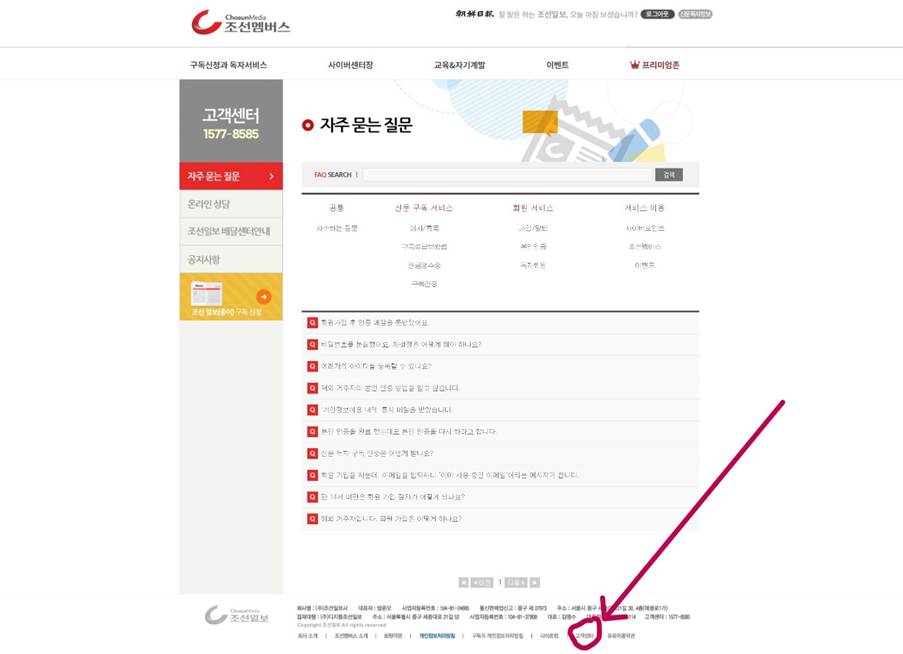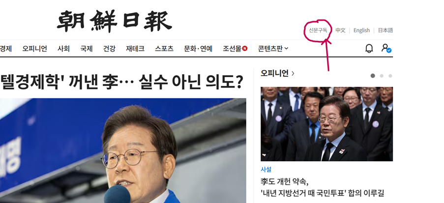 공식 웹사이트 신청: 조선일보 공식 웹사이트(chosun.com)에서 아래의 붉은 색 부분을 클릭하고 들어감.