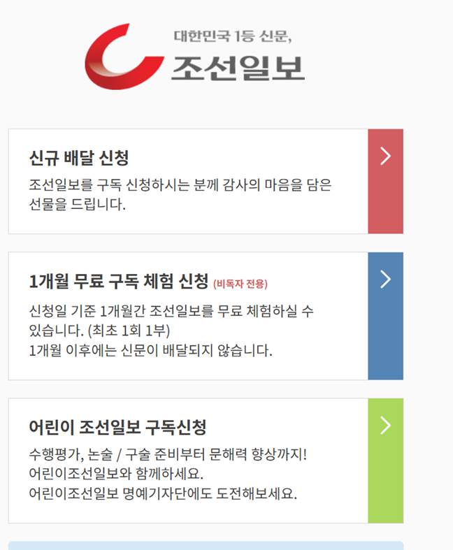 조선일보 구독을 원하는 분들은 아래 방법을 통해 신청할 수 있습니다.